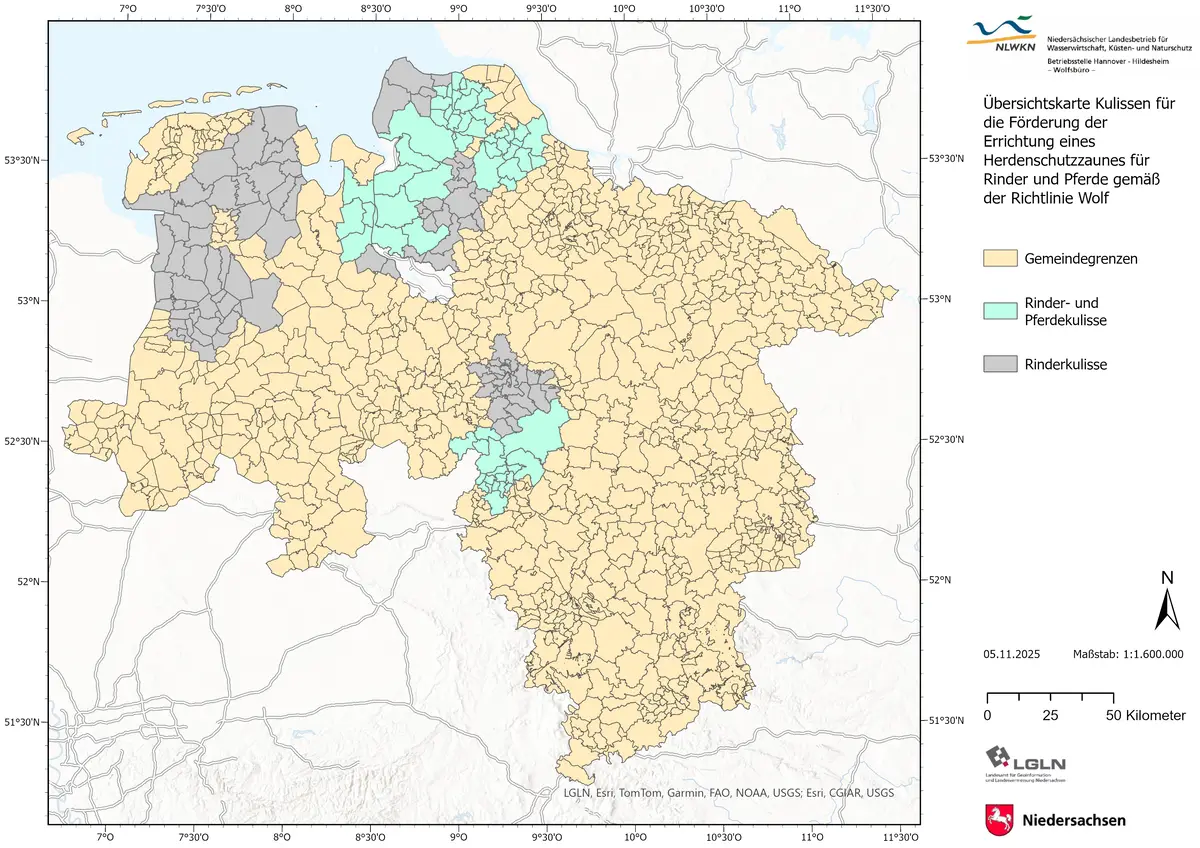 Eine Förderung von Herdenschutzmaßnahmen für Rinder bzw. Pferde ist in den hier aufgeführten Förderkulissen möglich. Eine genaure Darstellung der förderfähigen Gemeinden ist im Downloadbereich in den Detailkarten einzusehen.